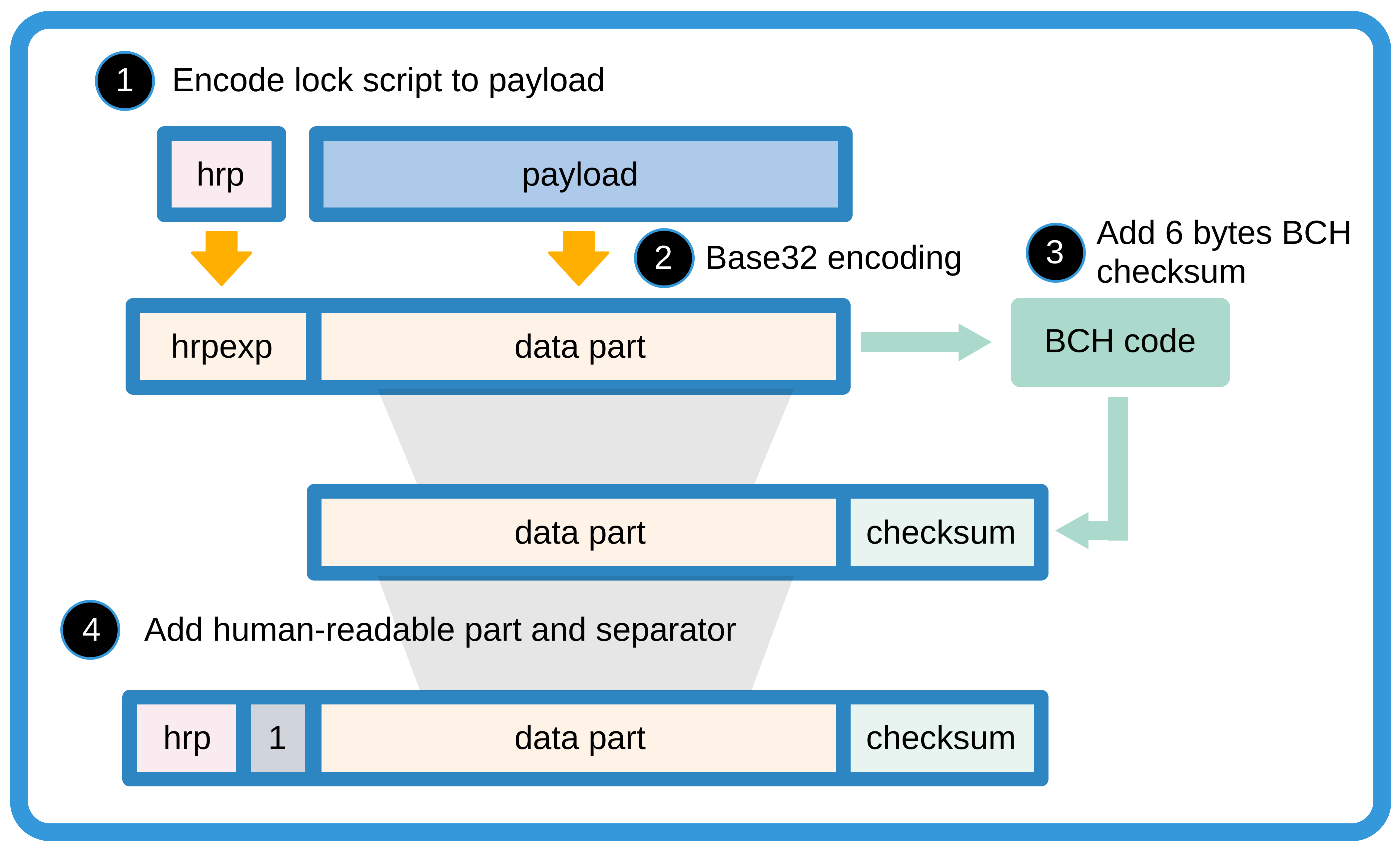 为了生成 CKB 地址,我们首先将锁脚本编码为字节数组,命名为 payload。然后,我们将有效形式转换为最终的地址格式。