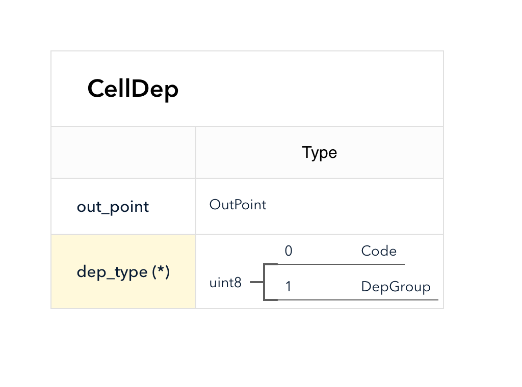 CellDep 结构中有个叫 dep_type 的字段,可以用于区分直接提供代码的普通 cells,还在 cell_deps 中通过扩展其成员的 DepGroup。