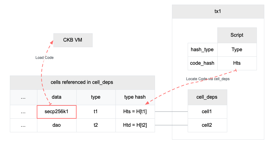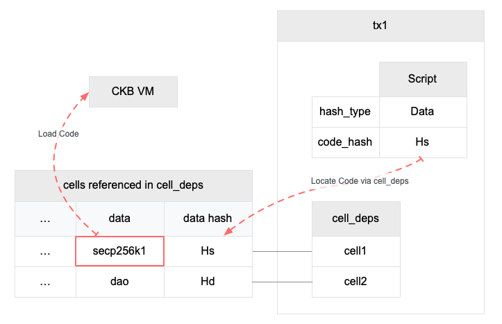 当 CKB-VM 需要运行一个脚本时,它必须要先找到它的代码。字段 code_hash 和 hash_type 就是用来定位代码的。