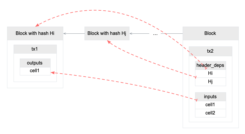 Header Deps 允许脚本去读取其哈希已经列在 header_deps 中的区块头。还有另一个先决条件,是交易只能在所有列在 header_deps 的区块都已经在链上时(叔块除外),才可以被添加到链上。