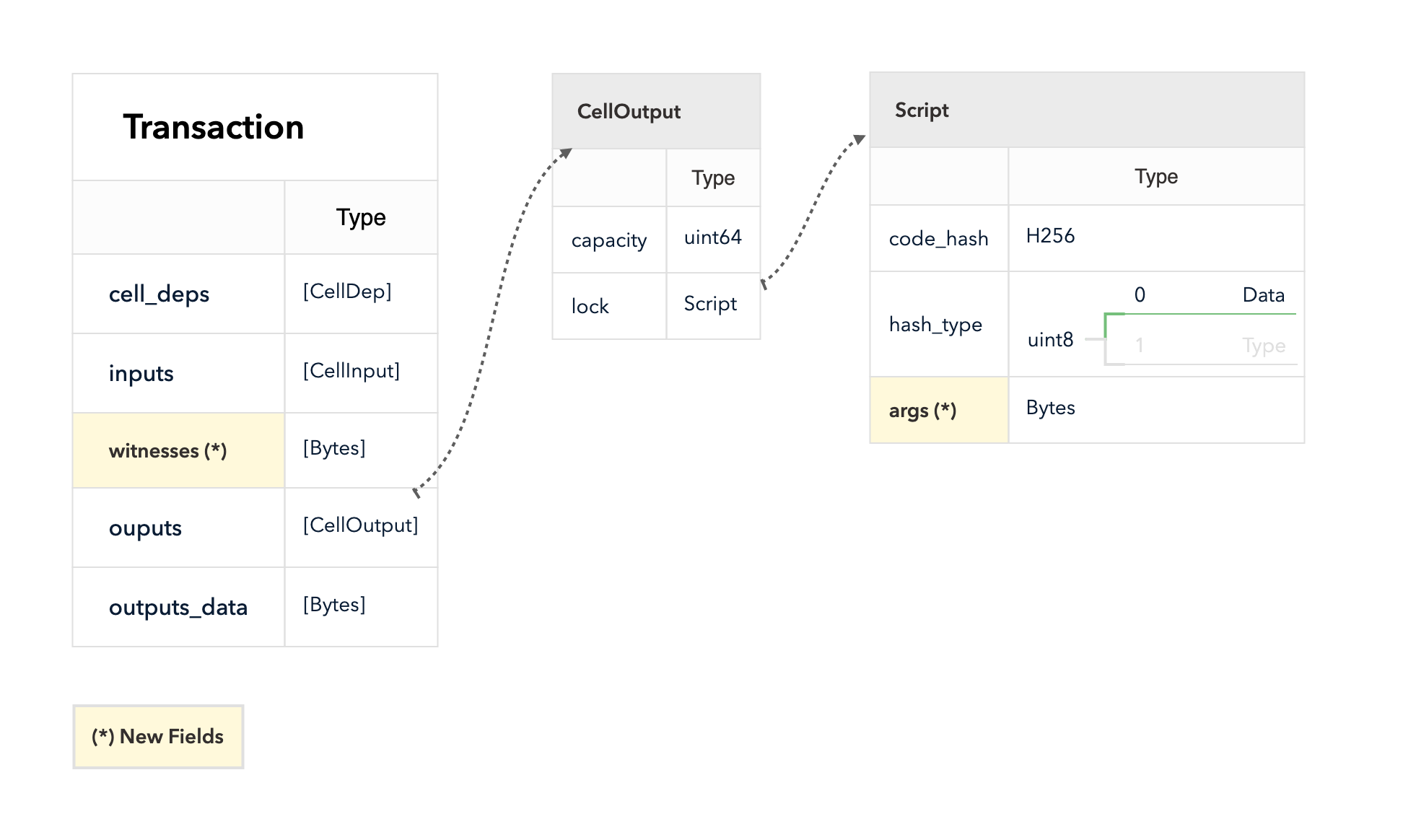 在 CKB 中,公钥指纹可以存储在脚本结构的 args 字段中,同时签名可以存储在交易的 witnesses 字段中。我使用「可以」是因为这只是一个推荐的方式,并被用在(系统)默认的 secp256k1 锁脚本中。脚本代码可以读取交易的任何一部分,所以锁脚本可以选择不同的协定,例如,可以将公钥信息存储在 cell 数据中。当然,如果所有的锁脚本都遵循推荐的协定,它可以简化创建交易的程序,比如钱包。
