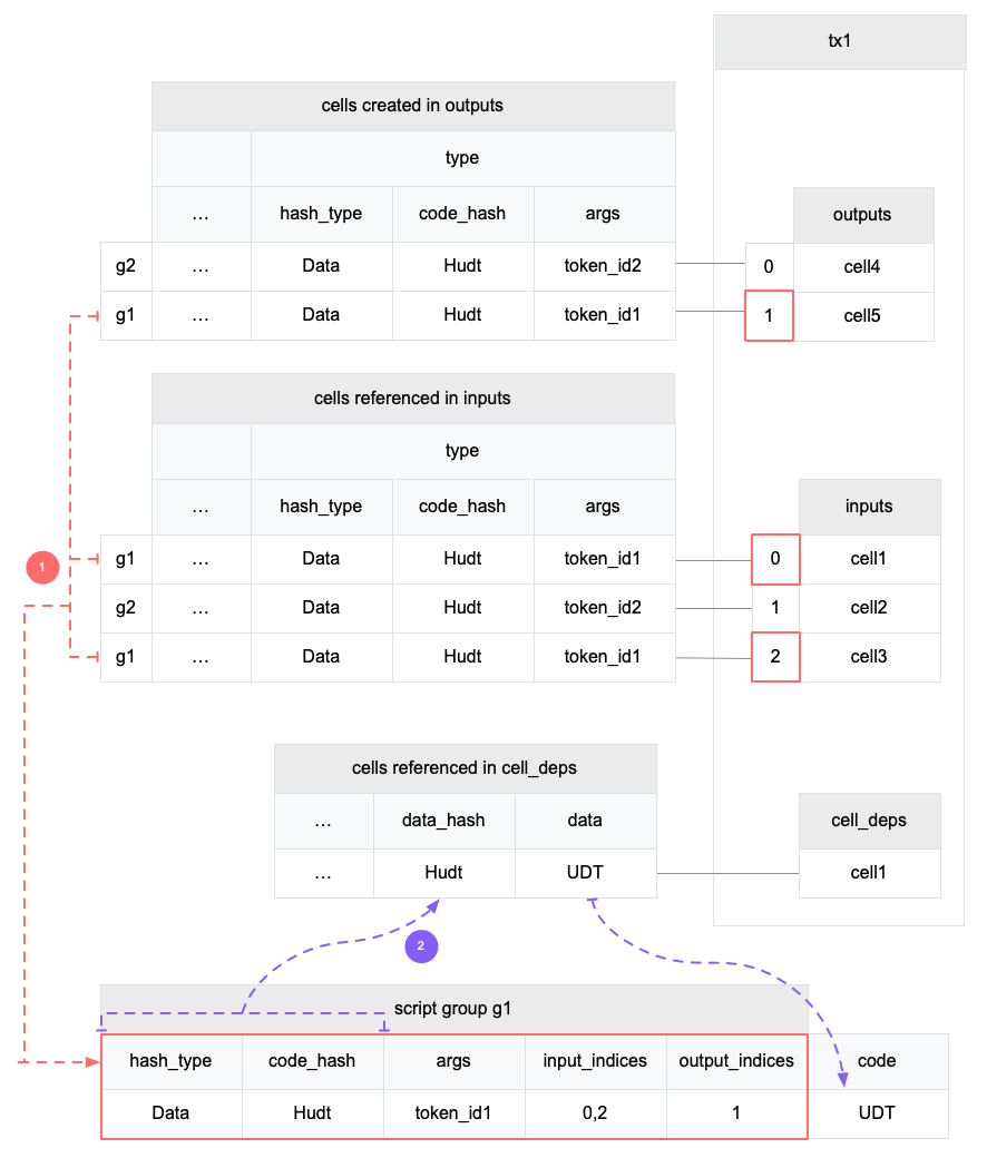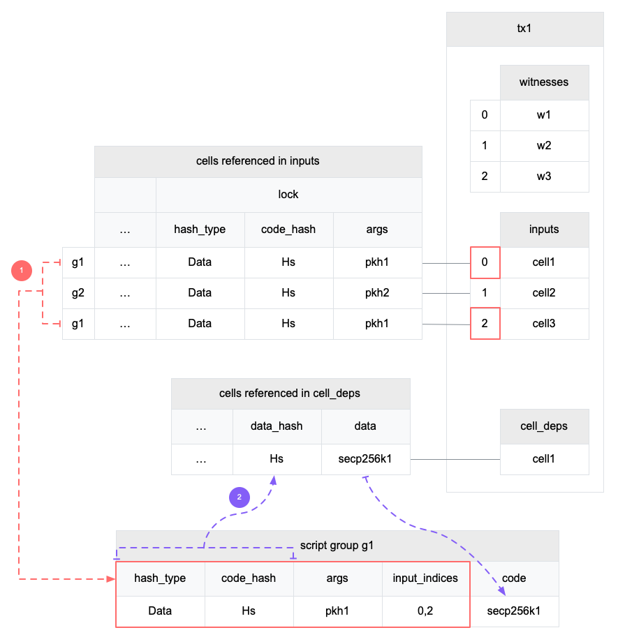 - 首先,CKB 会通过锁脚本对所有输入进行分组。在交易示例中,有两种不同的锁脚本在输入中被使用。虽然它们都定位到相同的代码,但它们有不同的 args。让我们来看一下 g1。这里有两个索引为 0 和 2 的输入。脚本和输入索引会在步骤三后被使用。