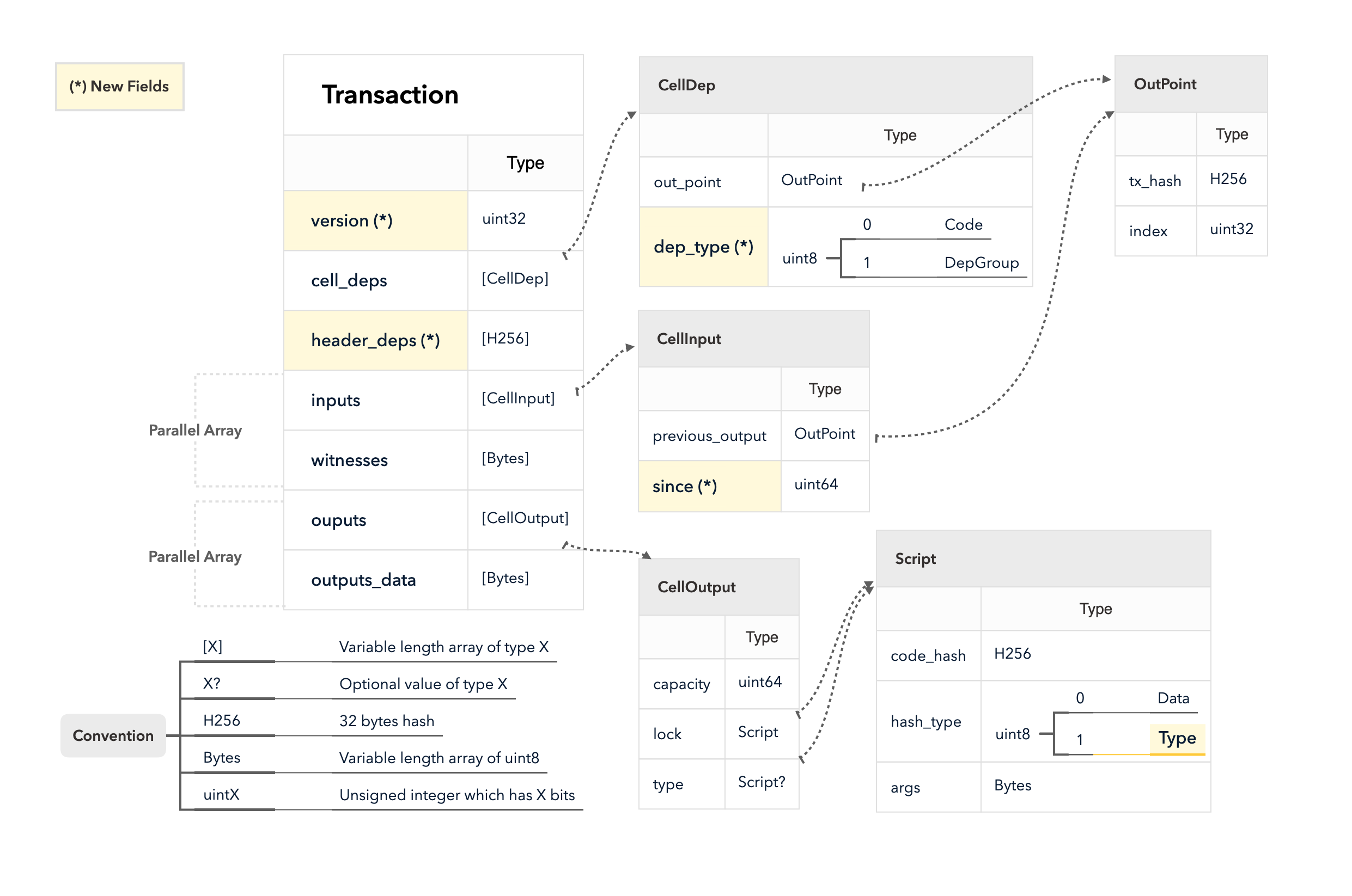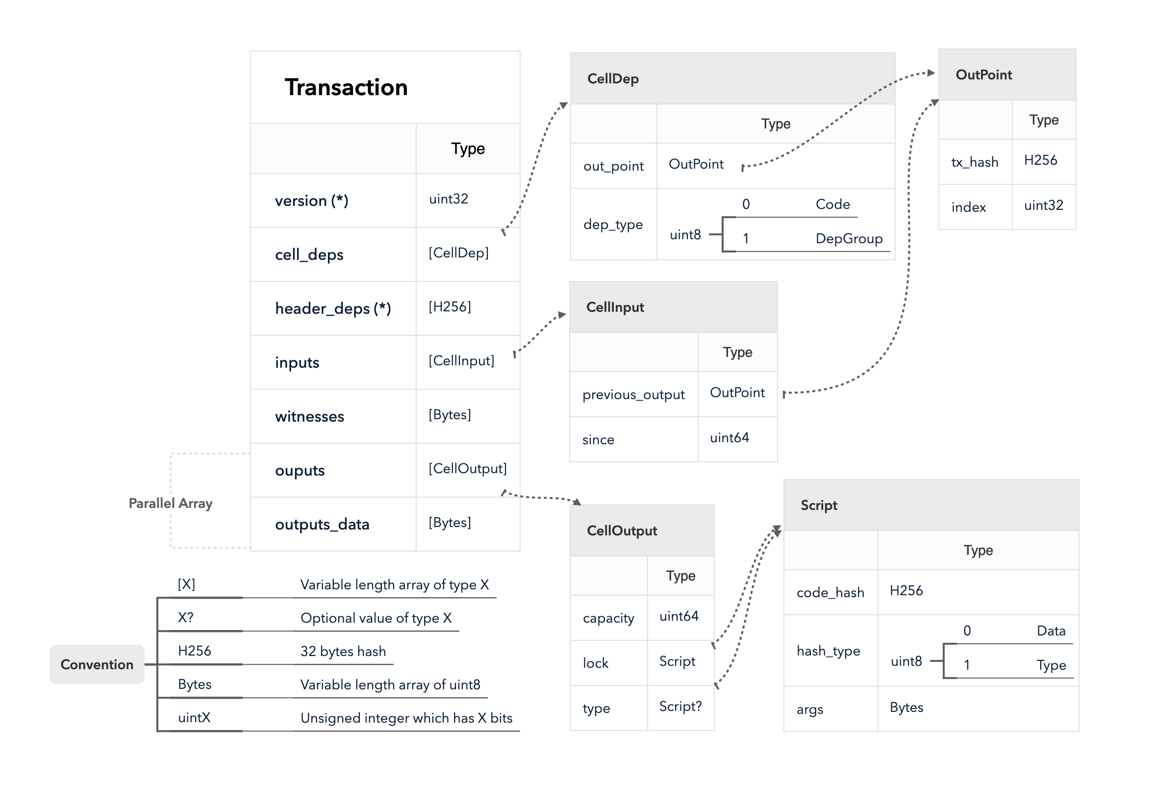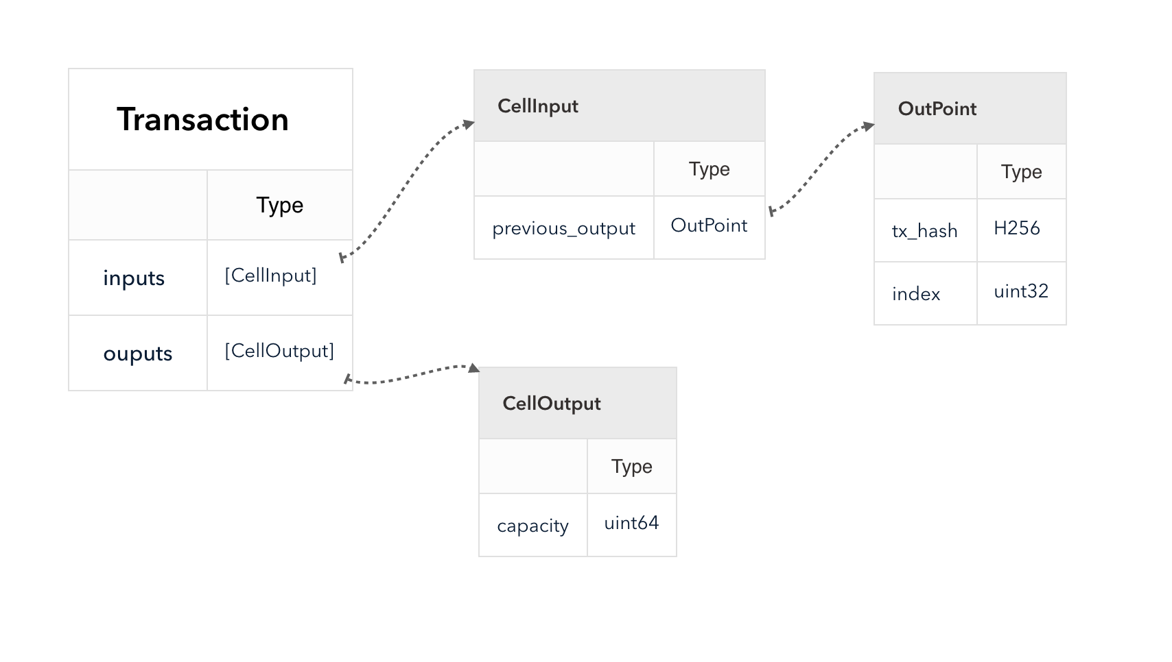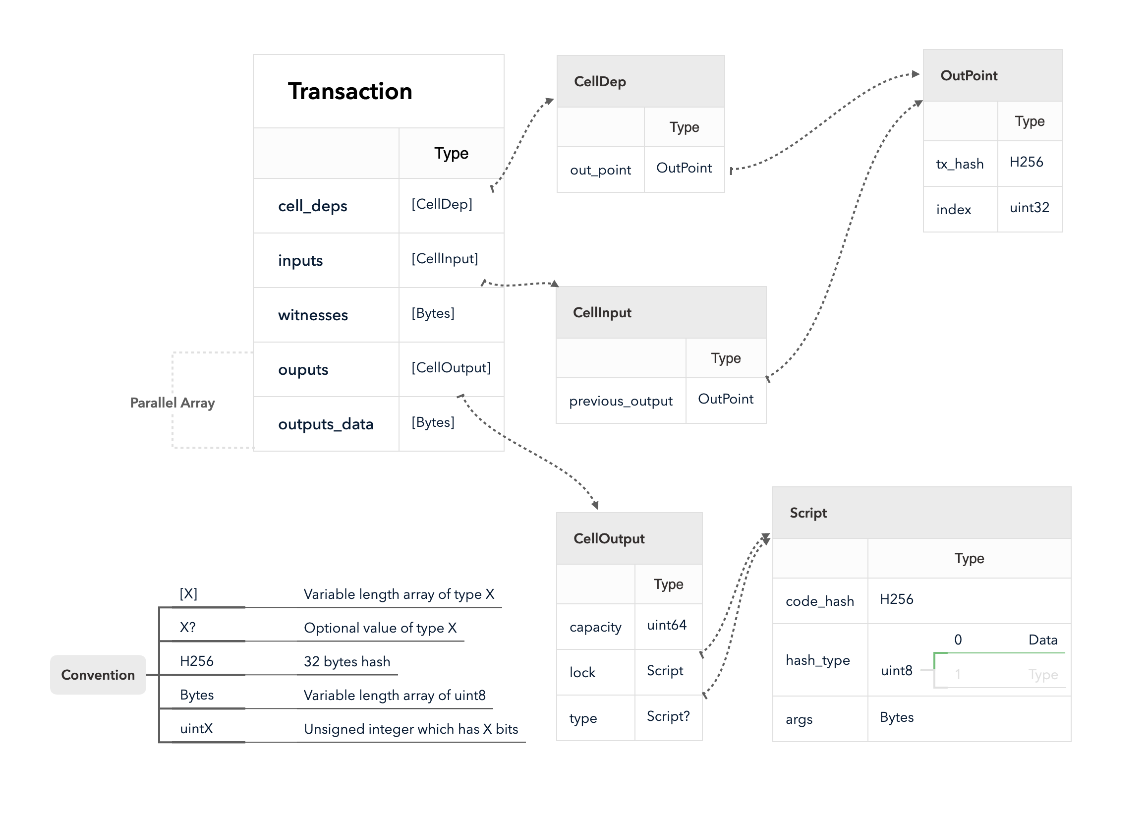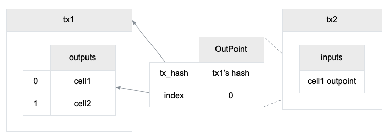 交易哈希是独一无二的。既然 Cell 总是被交易创建出来,而每一个新的 Cell 在交易输出的数组中都有自己的位置,所以我们可以通过交易哈希以及输出索引去引用一个 Cell。OutPoint 结构是一种引用类型。交易在输入时会使用 OutPoint 来引用先前被创建的 cells,而非将它们嵌入交易。