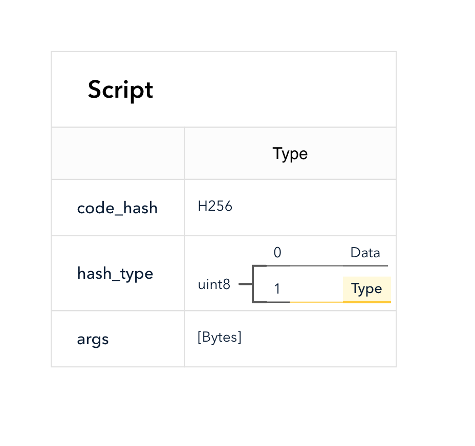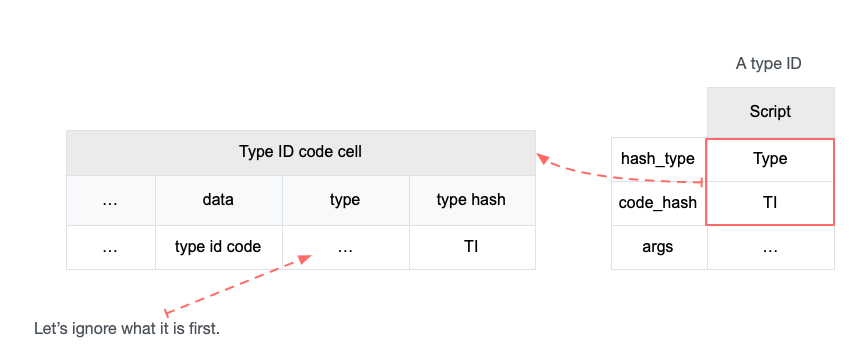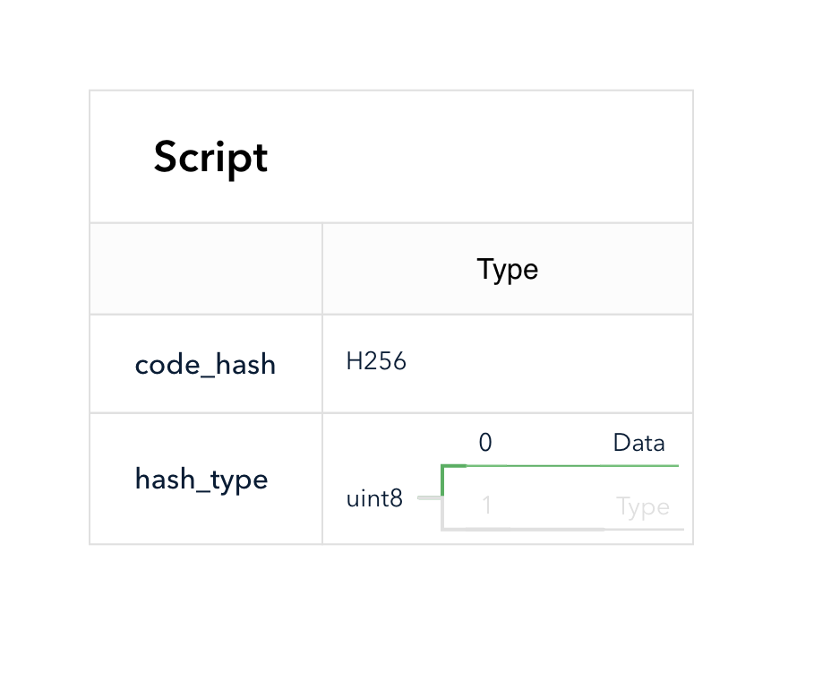 当脚本使用了 hash_type 的 Type,它会匹配相等于 code_hash 的类型脚本哈希的 Cell。类型脚本的哈希是从 Cell 的 type 字段中计算出来的(详见附录 A)。
